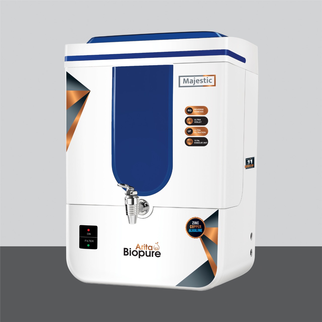 Arita Biopure, Majestic water purifier is designed with the most advanced purification technology of RO+ UV+ UF+ Copper+ ALKALINE+ MPH+ MINERAL BOOSTER that can help in protecting your family with the purest drinking water. Majestic RO water purifier added with active copper brings together the goodness of copper with alkaline and ensures that you receive pure and healthy drinking water. Beauty water Cartridge in Majestic gives you “low TDS & Low Ph” water for “Fair & Glow” skin (with face wash after bath).